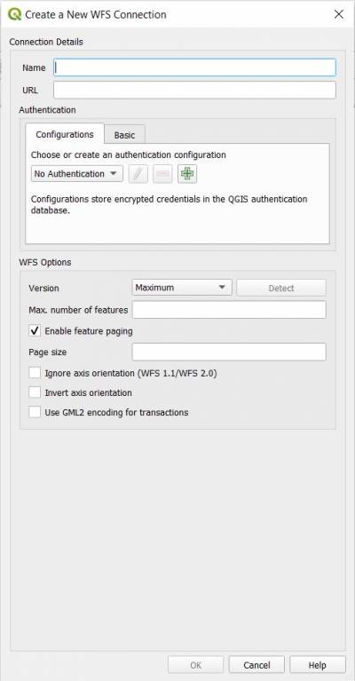 In the screenshot I am showing what the page should look like if the connection is successful (note that the box titled Only request features overlapping the view extent is UNCHECKED). Here, you would select the “New” option and the New Connection window will appear as it did through the previous route.